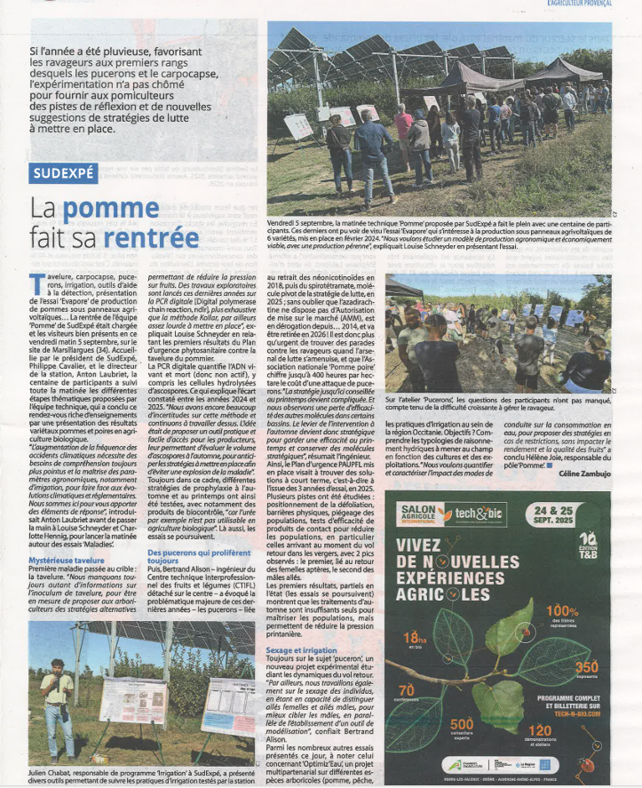 Vous trouverez ci-dessous un article paru dans le magazine hebdo "Agriculteur Provençal" rédigé par Céline Zambujo dans le cadre de la matinée Portes Ouvertes Pomme 2025 qui s’est déroulées le 5 septembre dernier à la station SudExpé à Marsillargues (30). 🍎