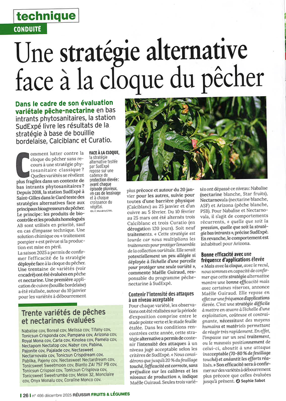 Cet article est consacré à la lutte de stratégie alternative face à la cloque du pêcher dans le cadre de son évaluation variétale pêche-nectarine et la présentation des résultats de la stratégie à base de bouillie bordelaise, Calciblanc et Curatio. 🍑