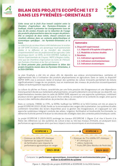 Cette revue est le fruit d’un travail conjoint entre SudExpé et la Chambre d’agriculture des Pyrénées-Orientales, visant à présenter les enseignements issus de dix années d’essais sur la réduction de l’usage des produits phytosanitaires dans les vergers de pêchers .